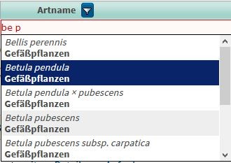 Dafür nimmt Euch das System aber eine Menge Arbeit ab. Ihr müsst es nur mit Abkürzungen jeder Art füttern und bekommt die passenden Arten direkt vorgeschlagen. Anstatt also "Bellis perennis" (=ausdauerndes Gänseblümchen) eingeben zu müssen, reicht auch "bel pe". Wer "be p" eingibt, bekommt auch noch Betula pendula, Betula pubescens usw.
